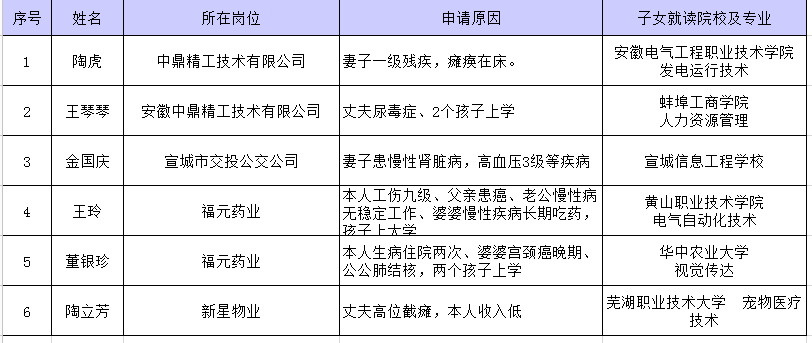 经职工申请,基层工会初审,职工服务中心审核,市总工会拟对6名困难职工家庭提供助学救助。为广泛听取社会各界意见,接受公众监督,体现公开、公平、公正原则,现将拟帮扶对象困难情况予以公示,公示时间为2025年9月8日至9月15日。如有不同意见,请与市总工会职工服务中心联系,联系电话:2717410。